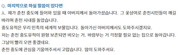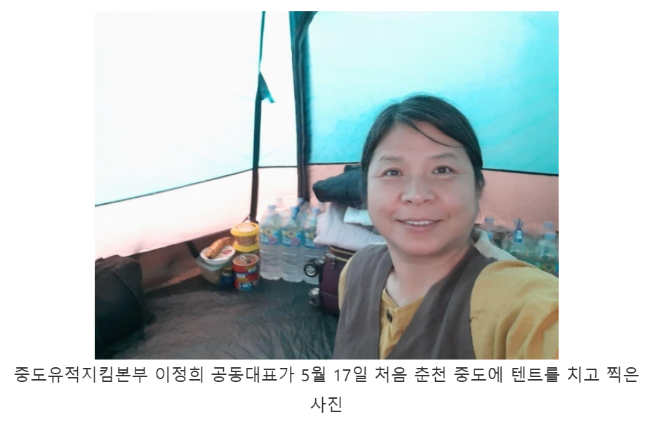 영상에 출연하기도 했던 이정희 중도유적지킴본부 대표의 인터뷰입니다. PD 수첩 보고 그의 이야기를 다시 읽으니 정말 대다수 맞는 말이더라고요. 집에서 나와 공사 현장 앞인 중도에 텐트 치고 지내면서 춘천역 가서 씻고 지내며 운동을 시작하셨다고 하던데 경외감이 들기도 했습니다. 생업을 위해 주 5일 출퇴근하면서도 운동에 참여하는 또 다른 시위대분들도 마찬가지고요.