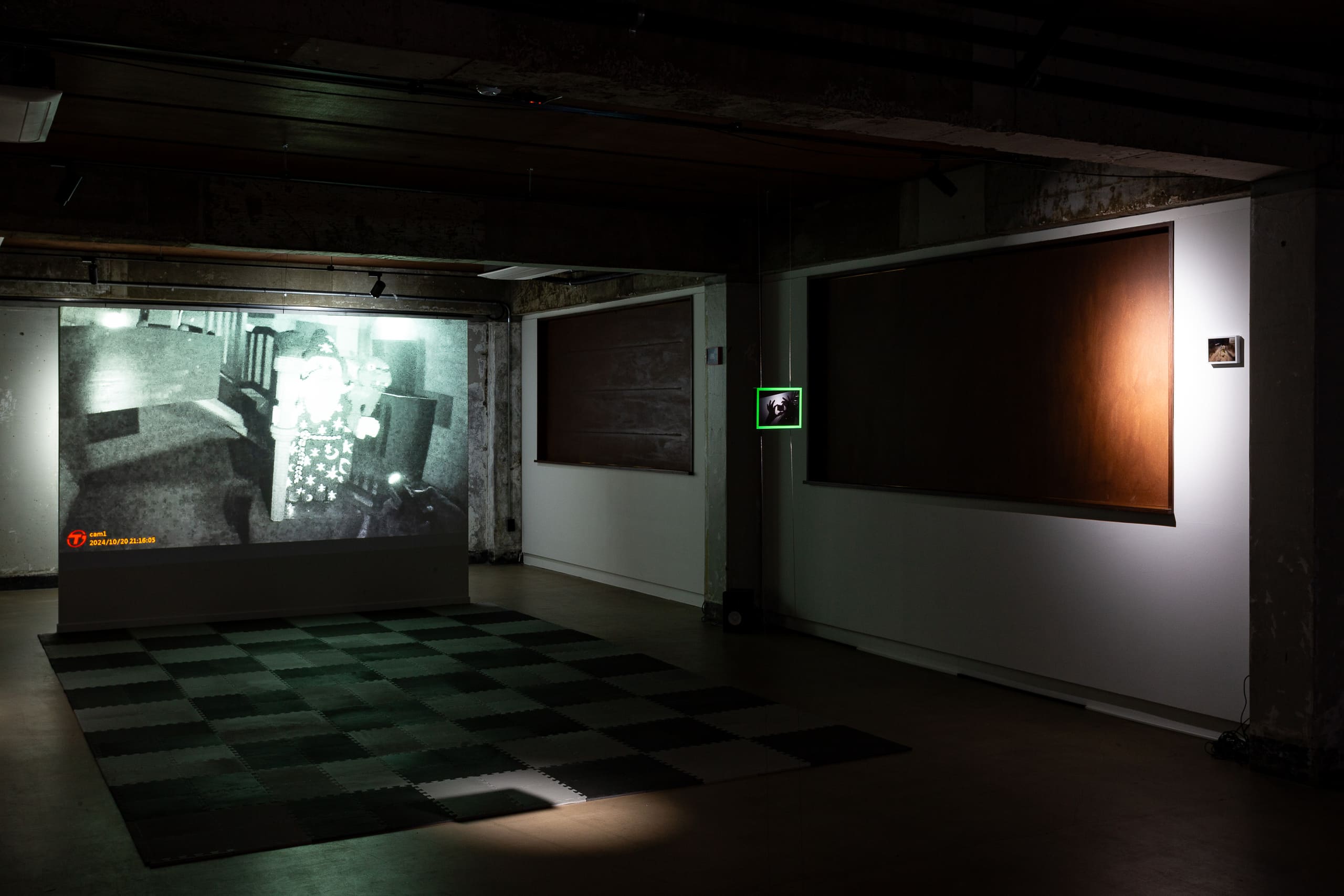 본 공간으로 들어가니 전시 제목과 동명의 작품인 영상 <경비원, 나팔수, 도깨비>을 관람하기에 적합한 환경이 조성되어 있더군요. 예술의 시간 전시장은 이번이 두 번째 방문인데, 완벽한 화이트 큐브는 아니었던 걸로 기억하거든요. 곳곳에 벽돌로 이루어진 벽이나 마감되지 않은 거친 벽면이 있고 그 사이사이 하얀색으로 마감된 벽면이 섞인 공간이었는데요. 조명을 모두 끄고 스팟 조명으로 사진 작품만 쬐니 영상이 가장 큰 존재감을 띠더라고요. 그래서 순순히 영상으로 향했습니다.