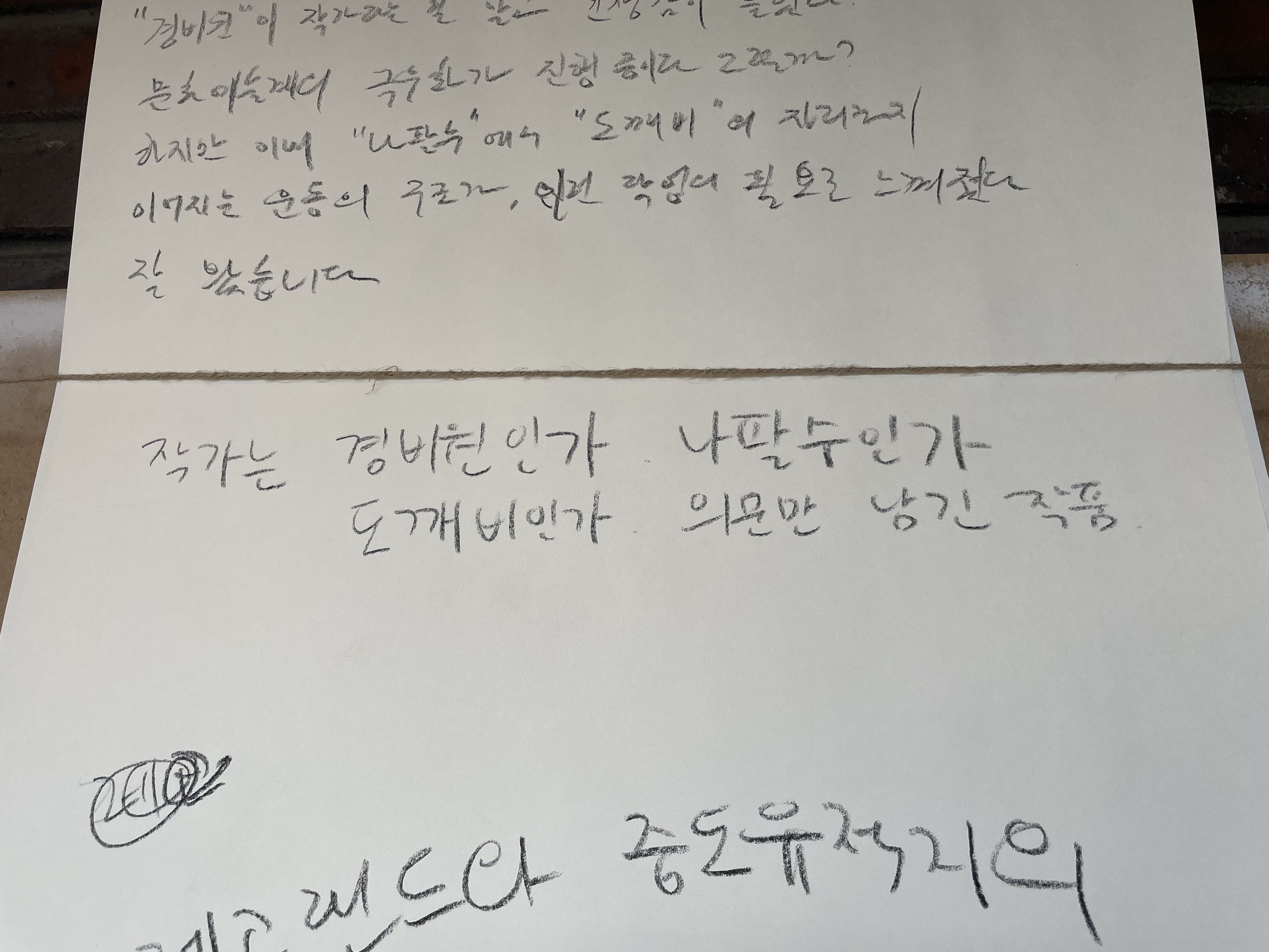 지난 5월 예술의 시간에서 열렸던 전시 《경비원, 나팔수, 도깨비》에 대한 제 감상을 공유하고자 연락드렸어요.