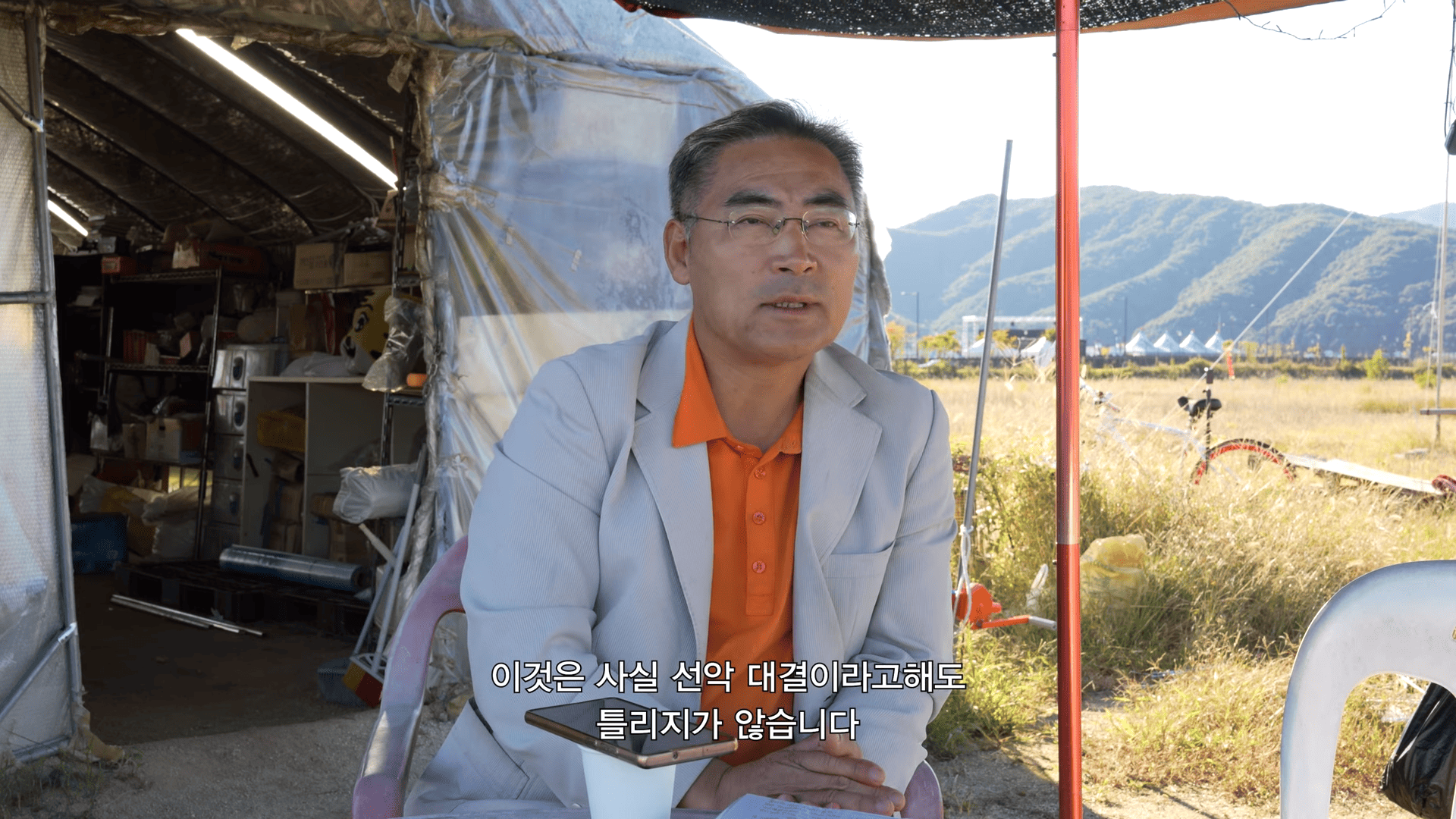 그러다 보니 레고랜드를 욕하는 인물들의 이야기보다 그것을 좋아하는 사람들, 말없이 비닐하우스를 짓는 중간적인 사람들을 봤을 때 더 마음이 복잡해지곤 했어요. 단군 초상화를 앞에 두고 제를 지내는 모습-영겁의 시간을 몸에 지며 살아가는 사람들-을 보고서는 마음이 숙연해지기도 하고요. 미디어에 비친 그들의 전형적인 모습보다 그 심연 혹은 이면에 있는 모습을 보게 될 때 상대를 더 잘 이해하게 되는 듯했네요. 그걸 포착하는 게 작가의 의도였을 거라 생각되고요.