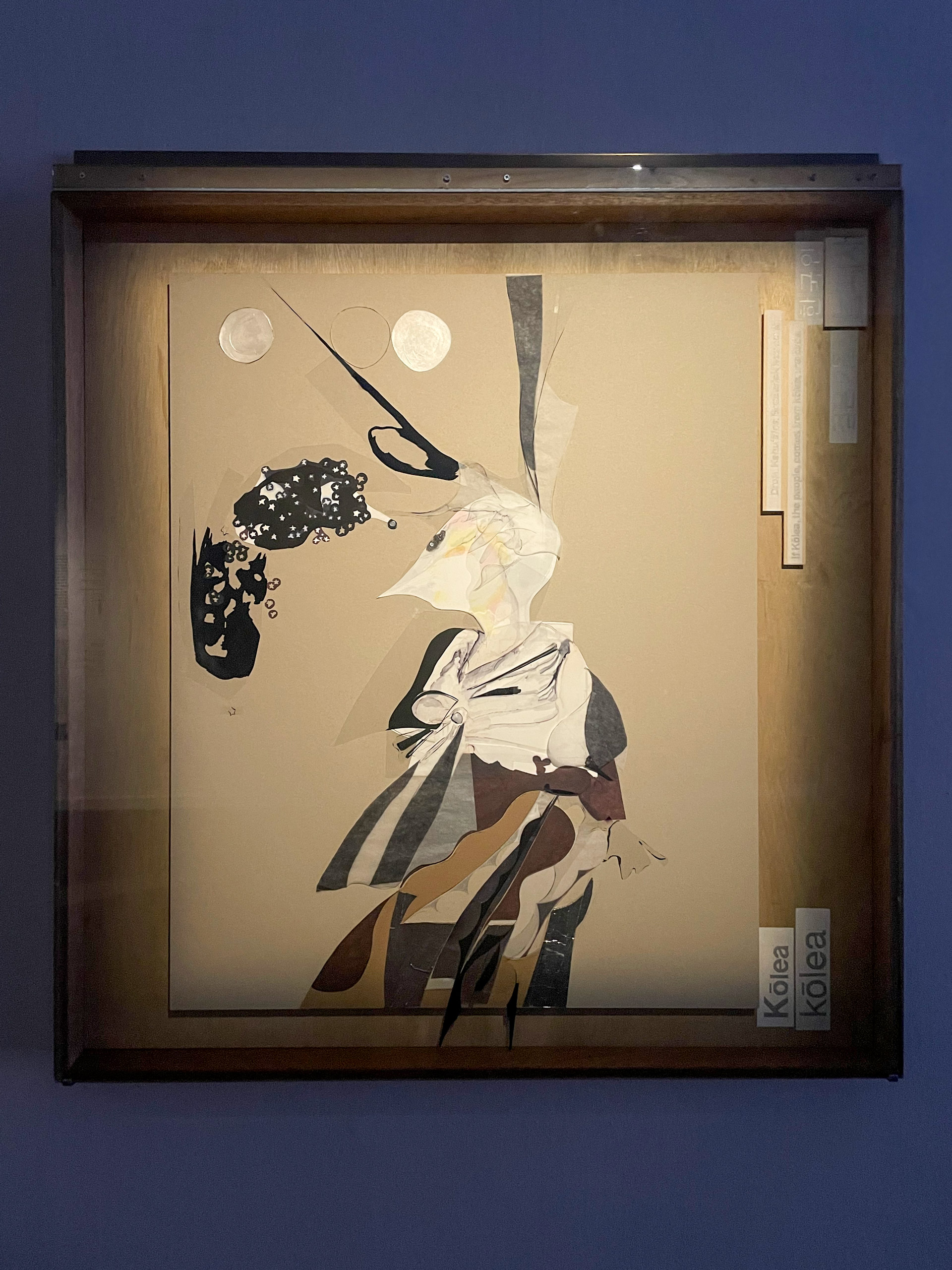 자신의 하와이 동료 Drew Kahuʻāina Broderick의 얼렁뚱땅한 질문 “한국인(Kōlea)은 검은가슴물떼새(Kōlea)에서 유래한 것인가?”를 옮긴 자막과, 흡사 한복을 입은 사람처럼 보이는 검은가슴물떼새가 그려진 콜라주 드로잉이 한 액자 안에서 짝지어진 작품인데요. 발음의 유사성만을 근거로 (아주 상관없어 보이는) 두 대상 사이의 관계를 조직하여 제시하는 이 논리가... 작가가 세상이란 지식을 이해하는 방식인 것처럼 느껴졌어요. 그를 뒷받침하는 자신감과 드로잉 실력도 주목하게 되고요.