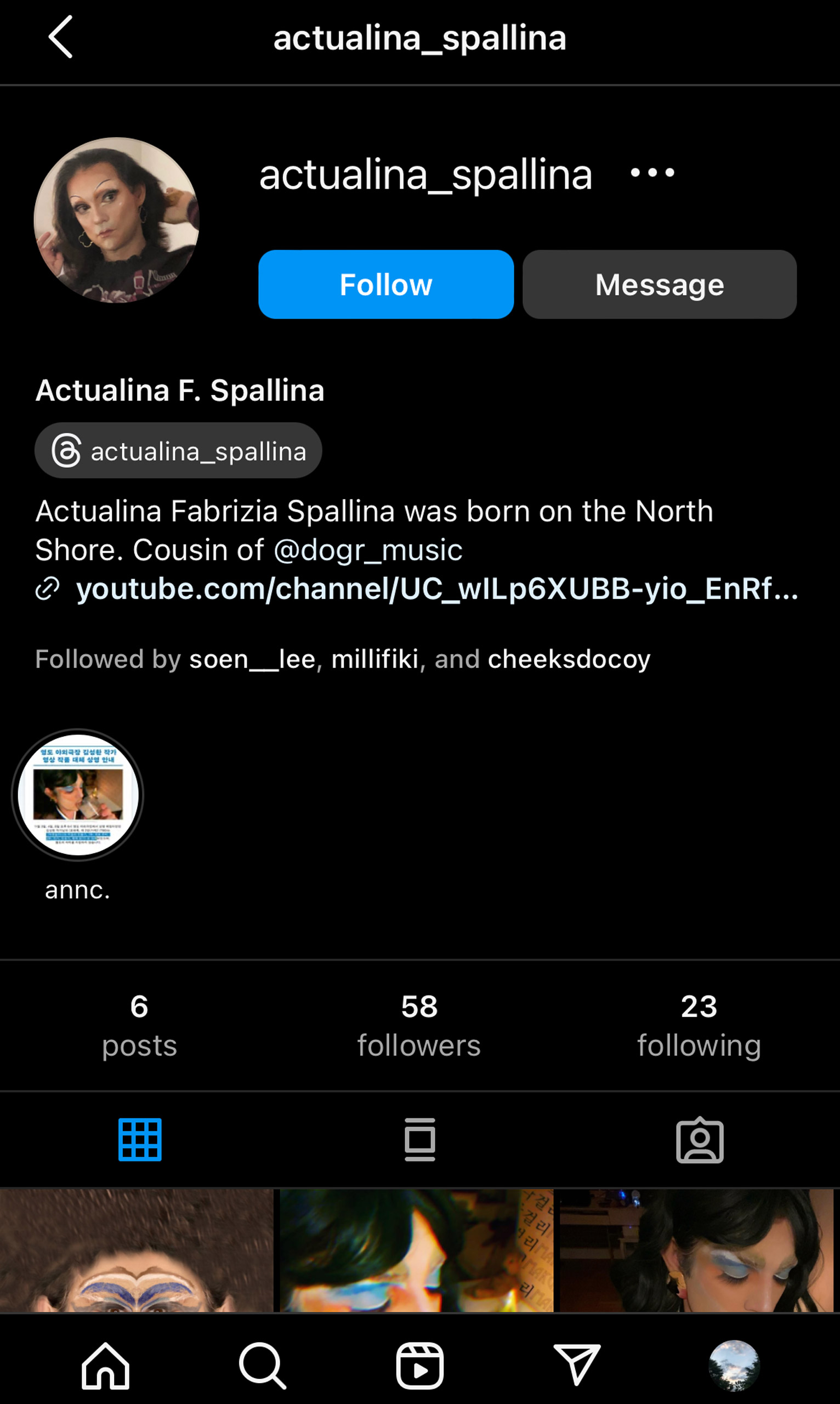 재훈: 인스타그램에 ‘@Actualina’ 검색해 봤더니 소개 글 끝자락에 ‘Cousin of @Dogr_music’이라고 나와 있더라고요. Dogr의 사촌이래요.