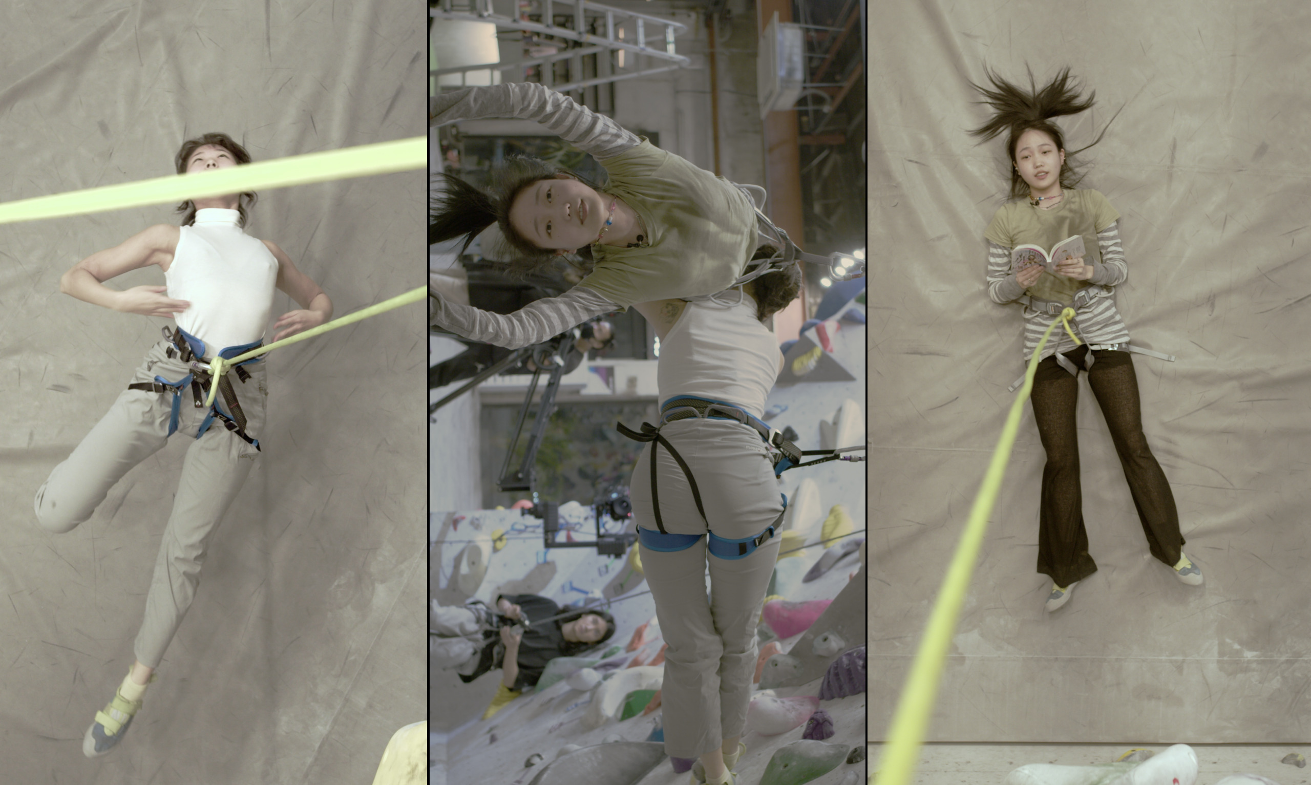 재훈: 영상 작업 <aono>는 ‘페어링 안무에서 성별에 따라 달라지는 몸의 움직임을 탐구하는 작업’이라고 소개되는데, 사실 영상을 보며 그 감각을 도드라지게 느끼지는 못했어요. 근데 퍼포먼스 <𝄆 climb, fronthook, angel, invert, daphne, figure head, scorpion, fall, gemini, princess, chopstick>(이하 <𝄆 climb>)에서는 조금 느껴지는 바가 있었거든요.