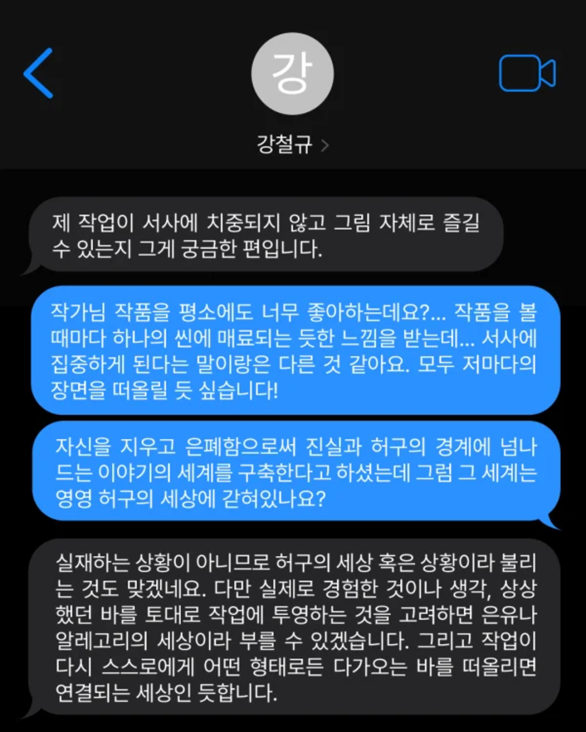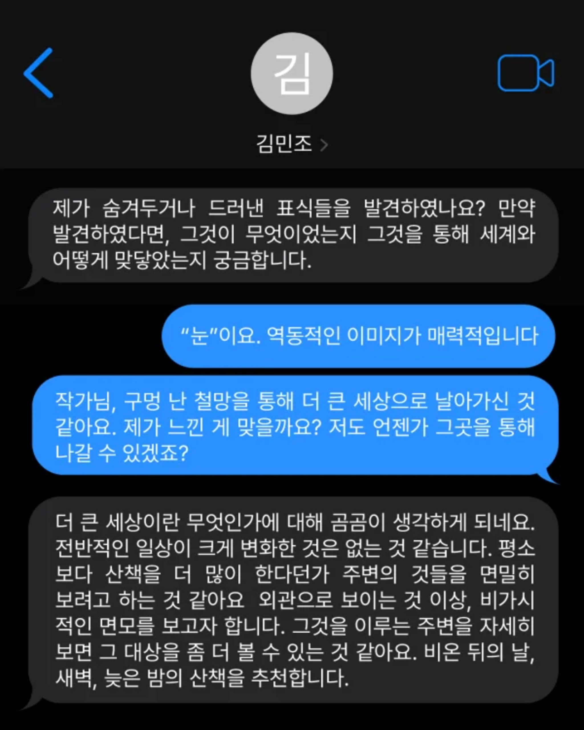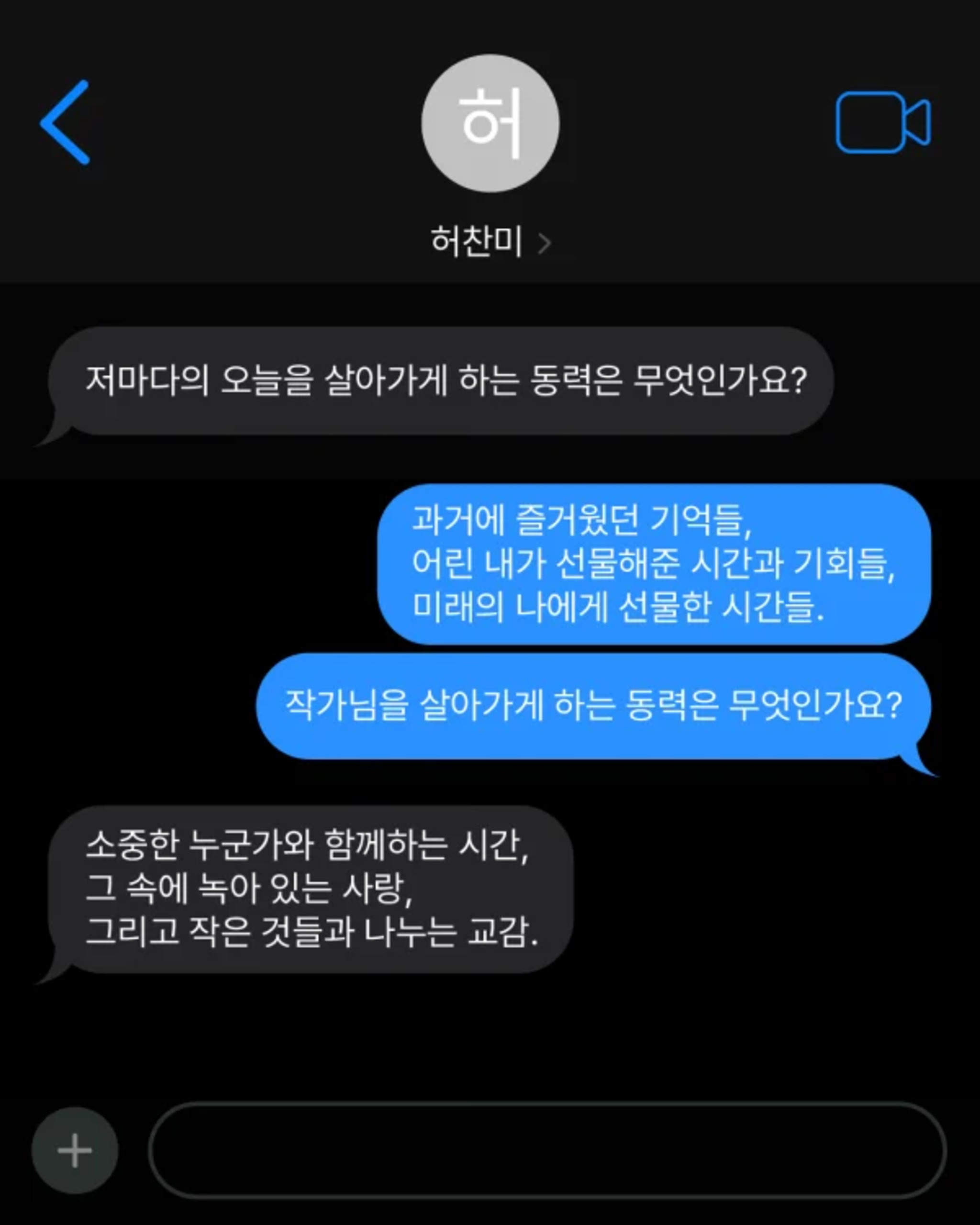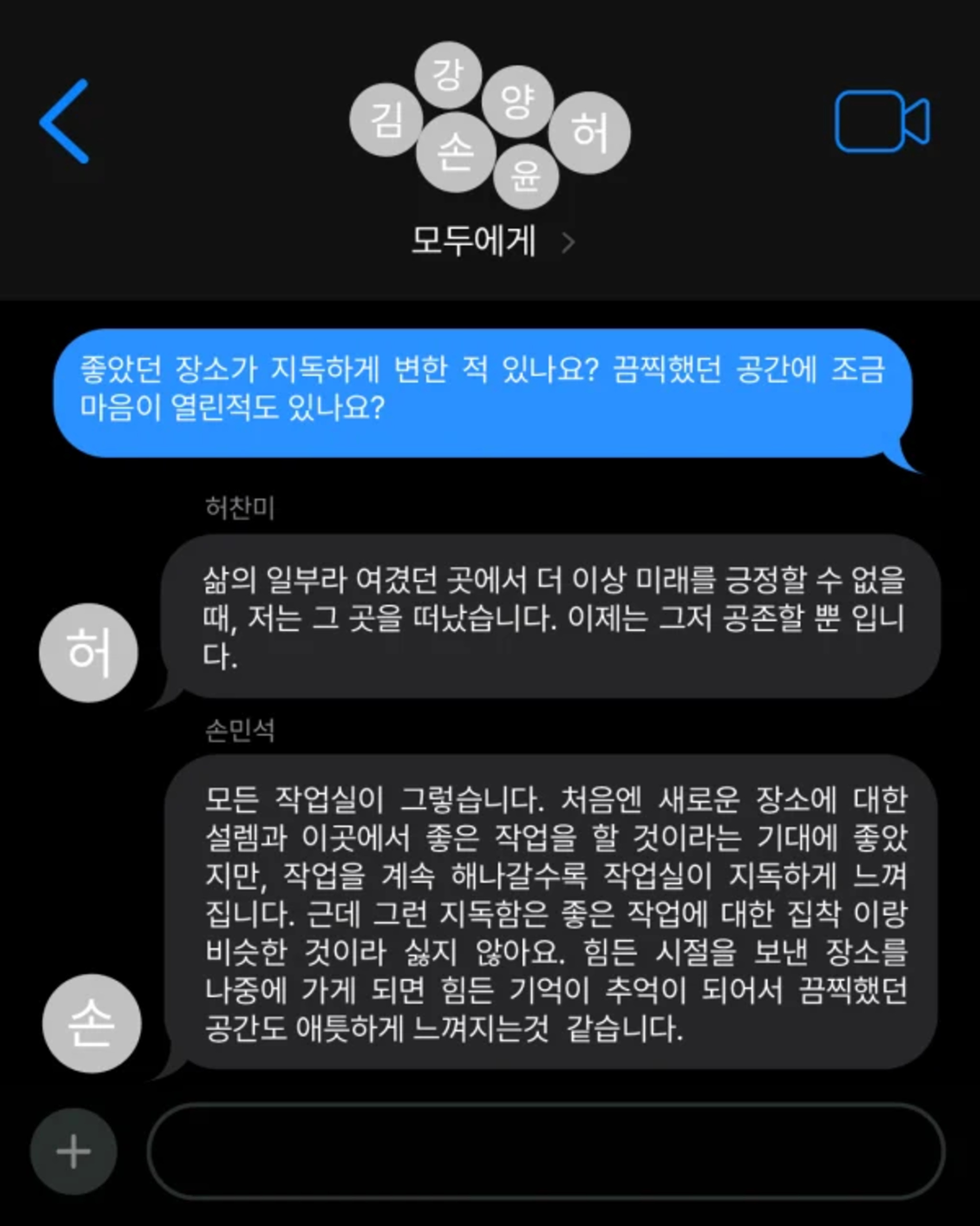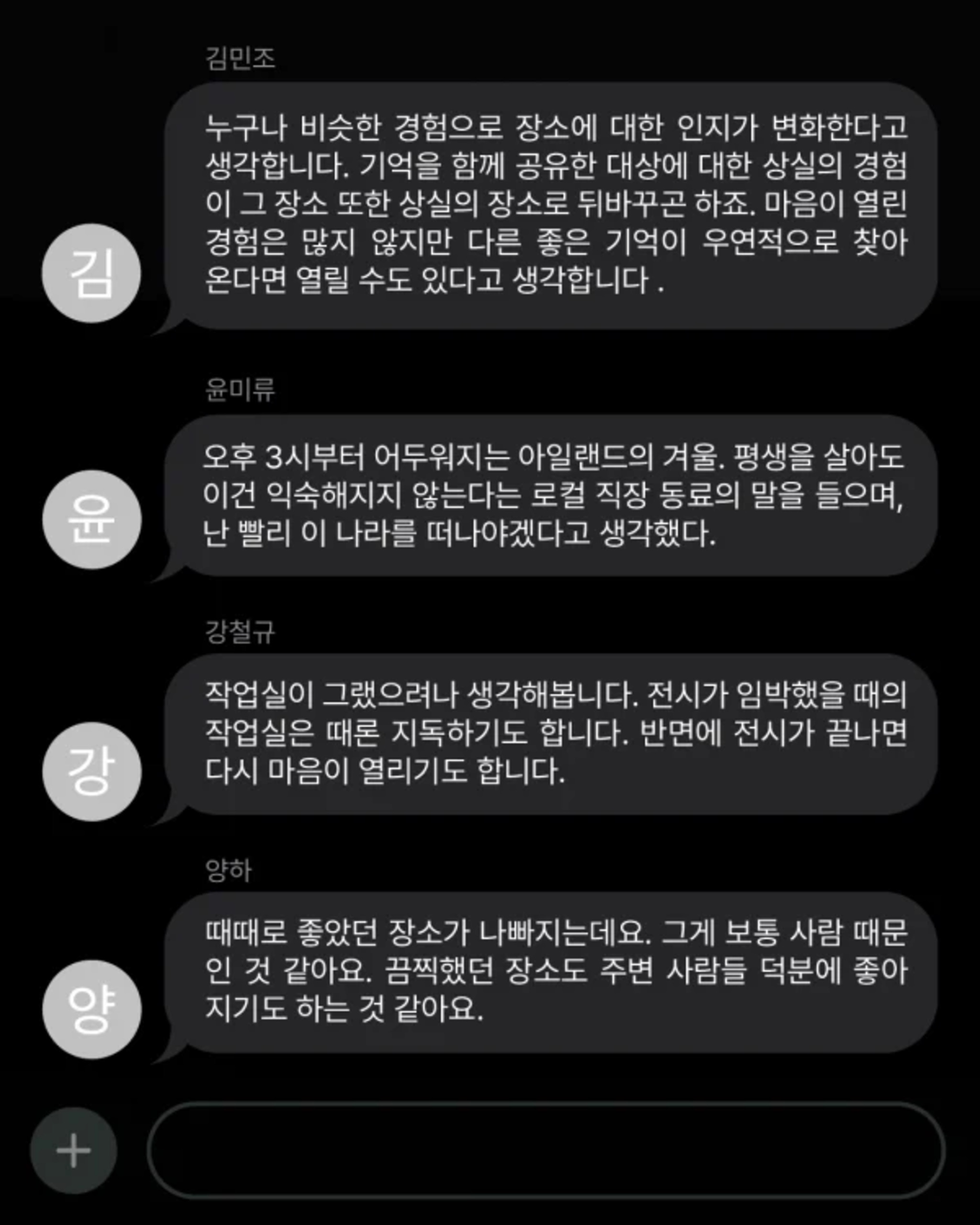 A2. 누군가의 감상 한 문장은 저에게 늘 가장 큰 영감이 돼요. 말씀하신 것처럼 함께 이야기를 나누면 물론 좋지만, 사실 처음 만난 사람들과 낯선 공간에서 다듬어지지 않은 감상을 그대로 꺼내는 건 쉽지 않잖아요. 그래서 오히려 익명의 누군가가 남긴 한 문장에서 더 솔직하고 날 것 같은 감정이 느껴지곤 합니다.
